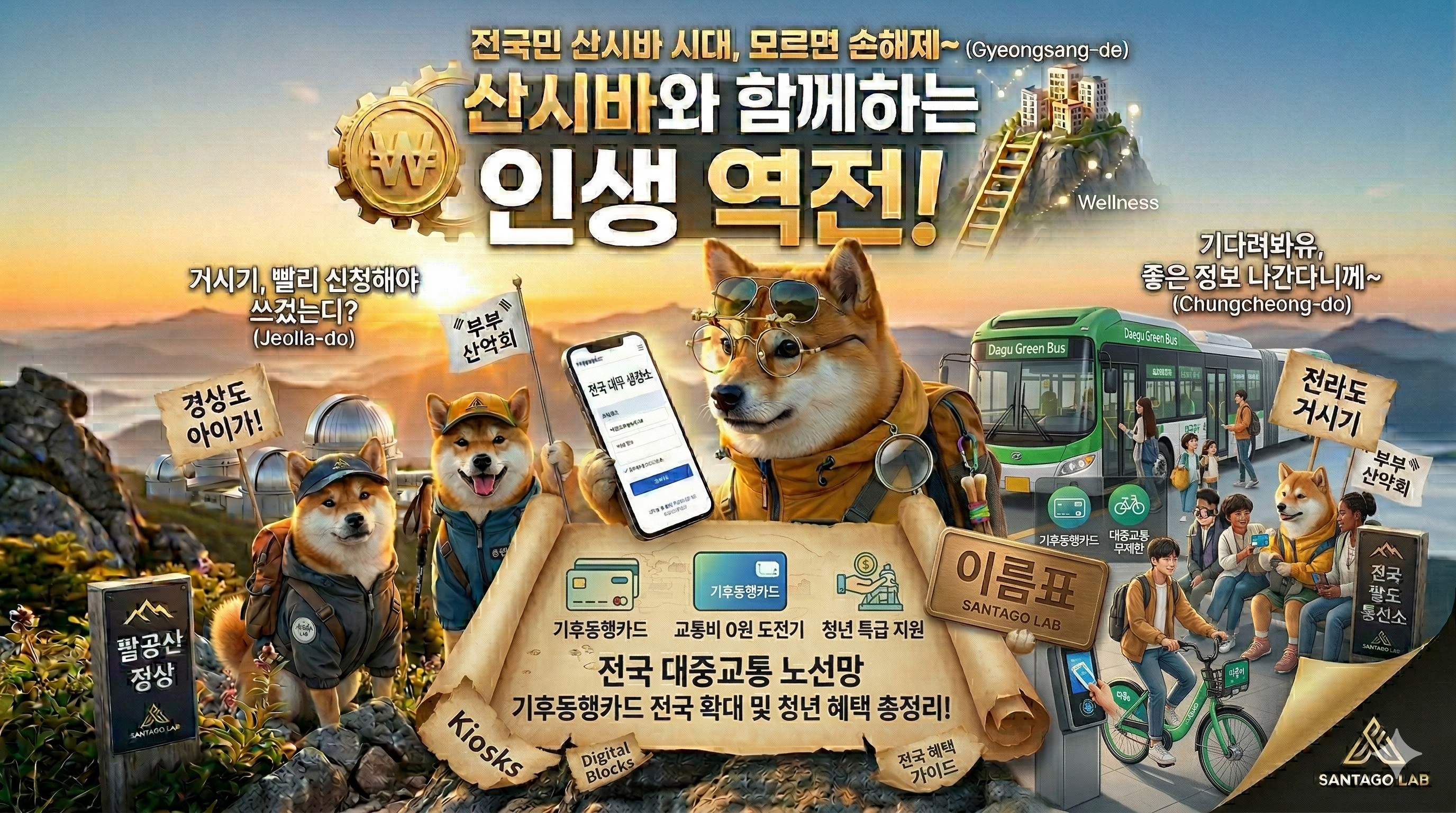 하지만 대원님들, 산행 중에 지칠 때 만나는 시원한 약수터처럼 교통비 부담을 싹 씻어줄 **'황금 카드'**가 있다는 사실, 알고 계셨나요? 오늘은 우리 산시바 정찰요원이 전국을 누비며 정찰해 온 2026년 최신 정보, **[기후동행카드 전국 확대 및 청년 특급 혜택]**을 총정리해 드리겠습니다. 이 카드를 등산 지팡이 삼아, 고물가 교통비 절벽을 가뿐하게 넘어가 봅시다.