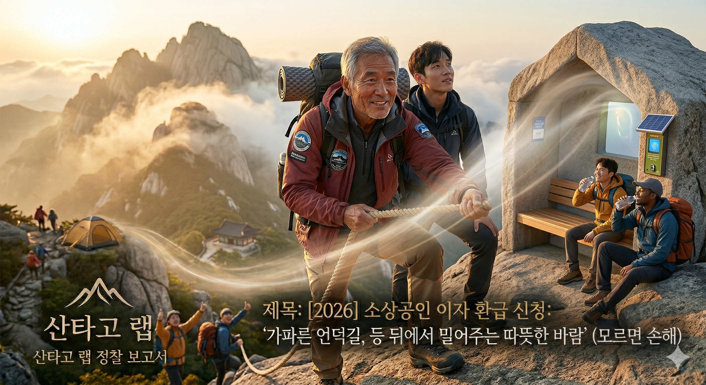 산타고 랩은 오늘, 그 모진 풍파 속에서도 등산화를 끈질기게 조여 매고 버텨주신 사장님들께 작은 위로를 전하려 합니다. 2026년 새롭게 시행되는 [소상공인 이자 환급] 소식입니다. 이건 단순한 정부 보조금이 아닙니다. 가파른 언덕길에서 숨이 턱 끝까지 차오른 여러분의 등 뒤에서 밀어주는, 작지만 따뜻한 응원의 바람입니다. 힘내세요